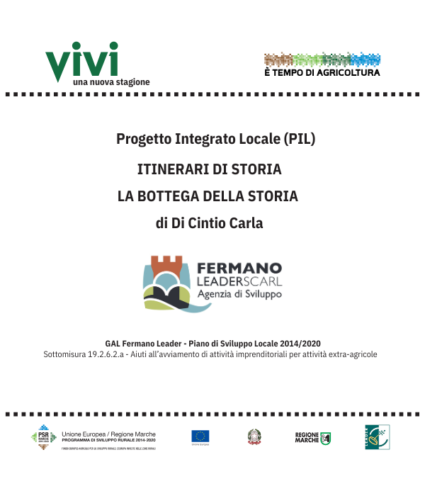 La Bottega della Storia nasce come idea progettuale presentata nell’ambito del Bando Sottomisura 19.2.6.2.A – PIL con l’intento di partecipare alla Progettazione Integrata Locale, promossa dalla Regione Marche e dal Gal “Fermano Leader”, al fine di valorizzare il patrimonio archeologico e culturale dei Comuni del PIL “Itinerari di storia”. Grazie al finanziamento ottenuto, La Bottega della Storia è diventata un’impresa individuale di servizi per enti, privati ed imprese nel settore della valorizzazione e del turismo culturale.